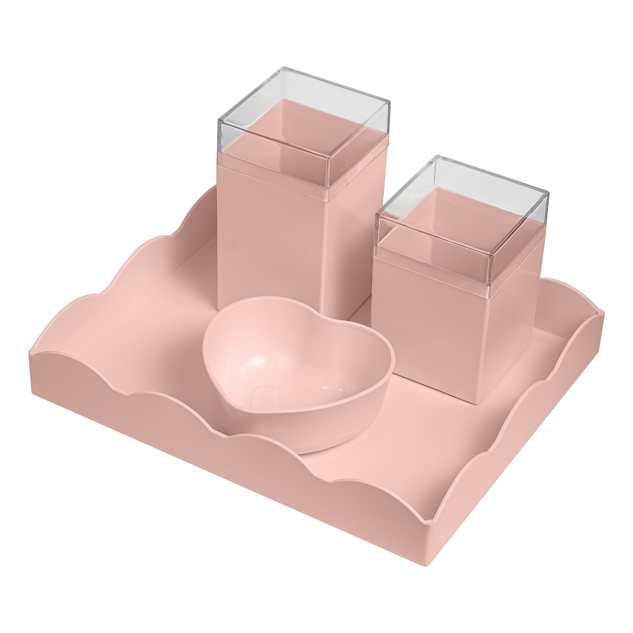 Composto por 4 peças essenciais — bandeja decorativa em formato de nuvem, potes com tampa para algodão e cotonetes, e molheira em formato de coração — o kit foi desenvolvido para tornar a rotina da higiene do bebê mais prática, segura e encantadora. A cor rosa suave proporciona um ar delicado e feminino ao ambiente, harmonizando perfeitamente com decorações clássicas ou modernas.
