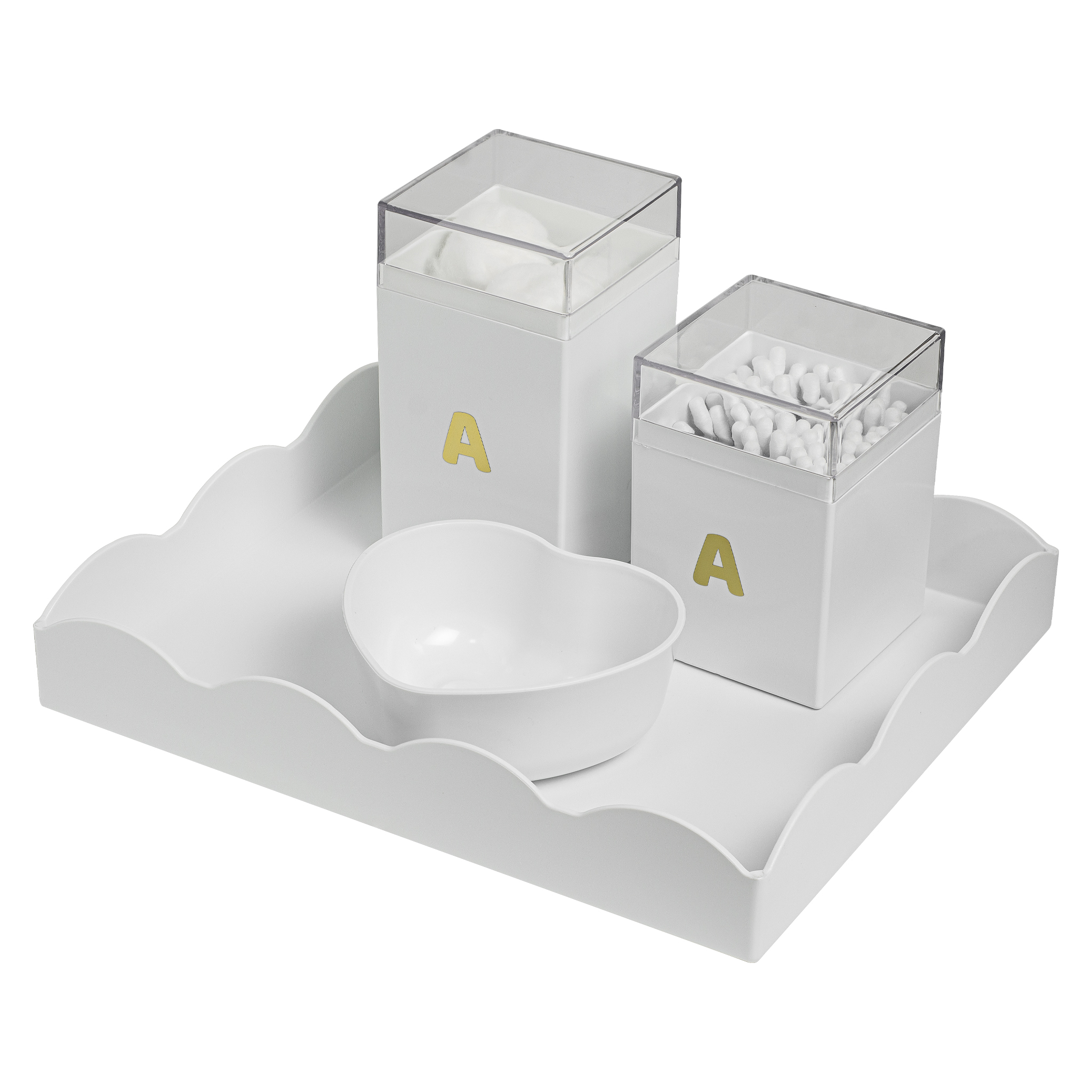 Composto por uma bandeja em formato de nuvem, dois potes organizadores com tampa em acrílico e um bowl em formato de coração, este conjunto é perfeito para facilitar a rotina dos pais com charme e bom gosto.